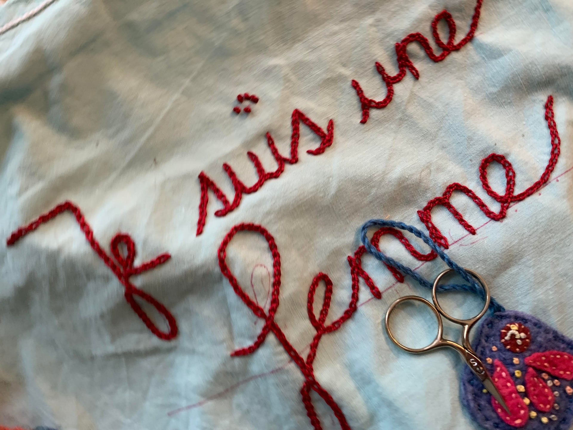 Je suis brodeuse autodidacte et j’aime varier les supports : papier, bois, céramique et bien sûr toute sorte de textiles.