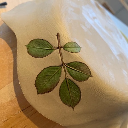 En ce moment, je prépare des coupes moulées en céramique avec empreintes de feuilles pour y broder des fleurs.