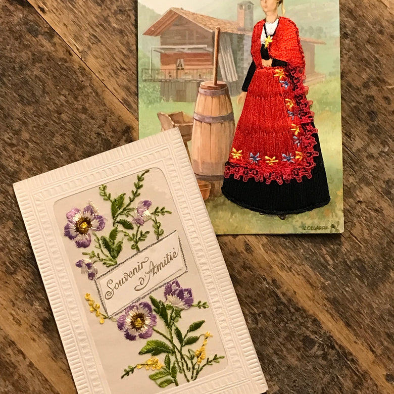 En découvrant la broderie sur papier contemporaine, j’ai repensé aux cartes postales de mon enfance, celles où de véritables morceaux de tissu venaient habiller les silhouettes.J’ai ensuite trouvé des cartes plus anciennes, parfois datées des années 1920.Pendant la Première Guerre mondiale, des soldats brodaient à la main des cartes qu’ils envoyaient à leurs proches. Ces pièces pleines de couleurs et de symboles racontent une histoire intime et touchante.